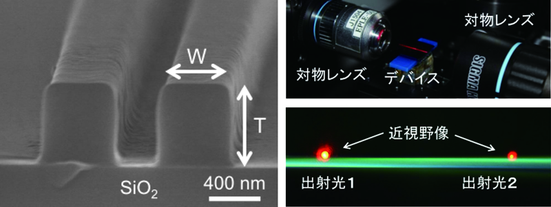 ポリマー導波路から成る方向性結合型光干渉計と微小流体システムとを統合した、微小・高感度なバイオセンシングデバイスを開発した。写真は、光干渉計部分の断面SEM像及び測定の様子。