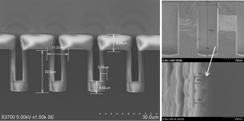 破壊電界強度(TZBD) > 4.5MV/cm. フィルムストレス20MPa以下(厚さ10μm成膜時),ステップカバレッジ40%(A/R=2 開口10μm, 深さ20μm)。ステップカバレッジ25%(A/R=3 開口100μm, 深さ300μm)