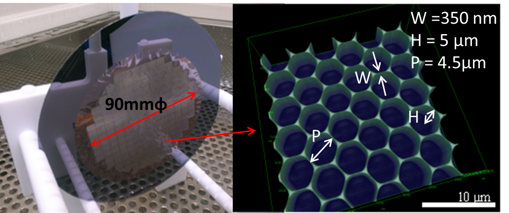概要 Siウェハに作製された光学グリット。幅350nm,高さ5μm,直径90mm.