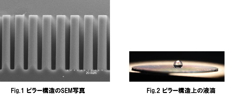 | 概要 | Si基板上にピラー構造を作製し、その上の液滴の蒸発挙動などを研究 Si基板へマスクアライナー、深掘エッチング装置により高アスペクト比加工(5μmφ×30μm)、ピラー構造を作製(Fig.1)。ピラーを敷き詰めたシリコン基板上の液滴の状況(接触角:130°)(Fig.2) ※詳細画像はこちら※ |